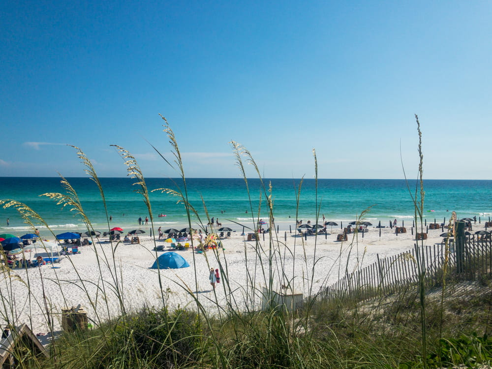 The beach at Blue Mountain Beach delivers exactly what draws travelers to Florida’s Emerald Coast: bright white quartz sand that squeaks underfoot, emerald-green water so clear you can spot fish from the shore, and gentle surf perfect for wading and swimming.